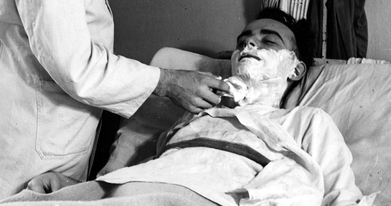 Légende d'origine : "Im Dienste für unsere Verwundeten. Hinter den Kulissen eines Gross-Lazaretts. 3. Der ""Figaro"" des Lazaretts ist willkommener Besuch. [Série N° 1443 - Photo N° 3] [Abdruck nur unter Angabe (Mauritius) gestattet] [Sipho] [Frei gegeben durch Zensur] "
